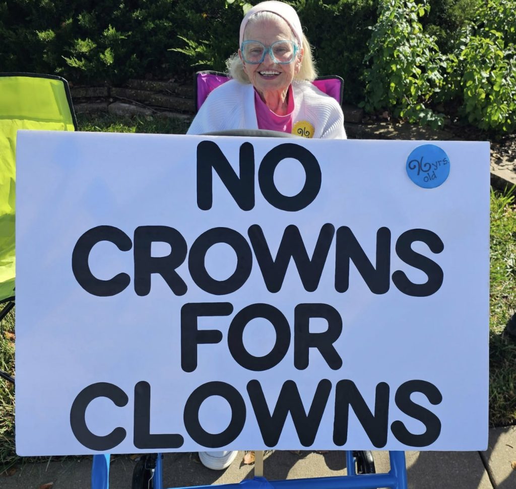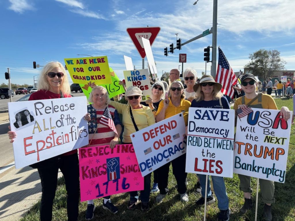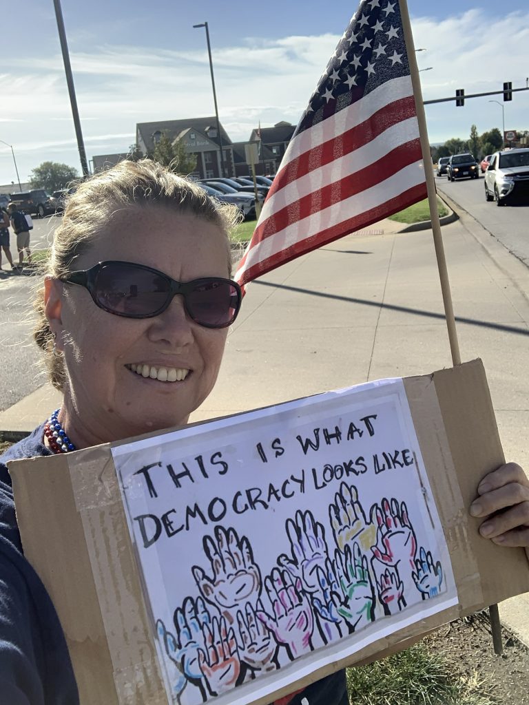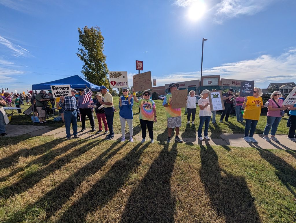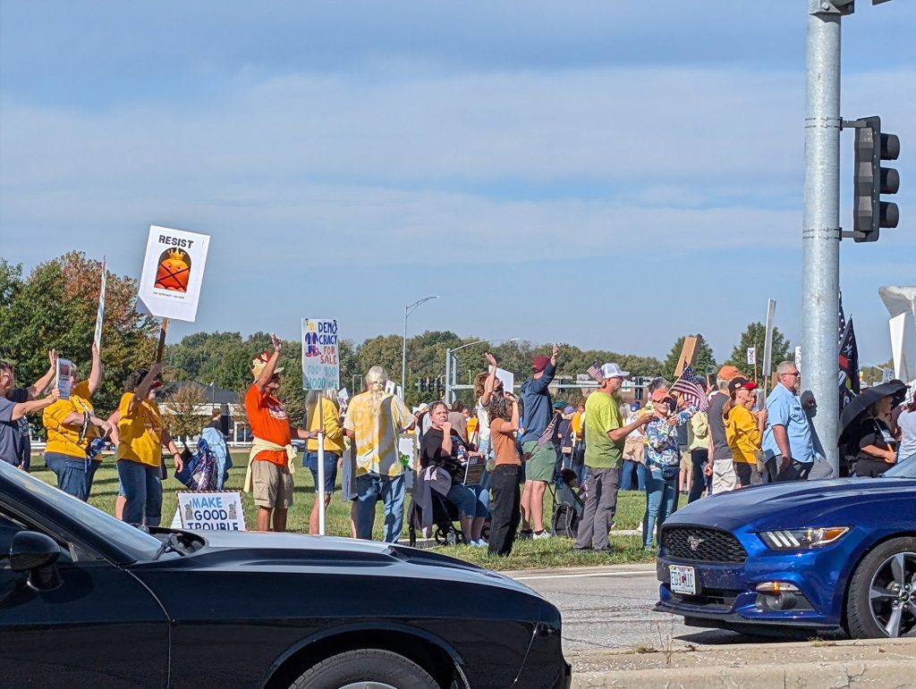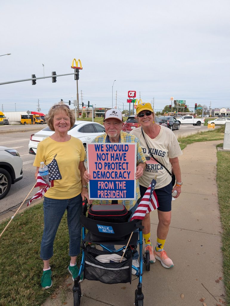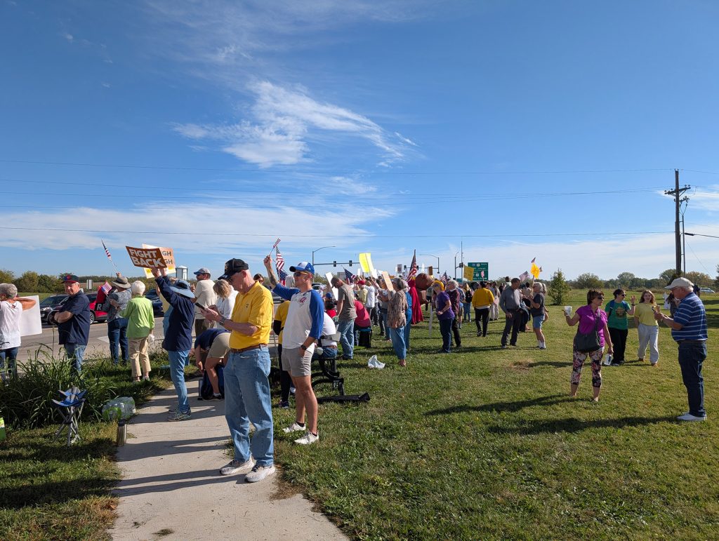 On Saturday, October 18th, a crowd of around 200 people was expected in the small town of Platte City, Missouri, the county seat of Platte County. Imagine how excited we were to have over 500 people come together to say “No Kings in America”! It was a joyous day filled with laughter and chants and, most notably, there were many more cars honking than people yelling at us. How exciting! We had veterans, young people, grandparents, families – even dogs joining together for democracy. All were happy that we had the event in our county as they understand the critical need to turn Platte County blue. We even had Kansans join us from across the river in Leavenworth! Here are just a few of the pictures we were able to gather that day.